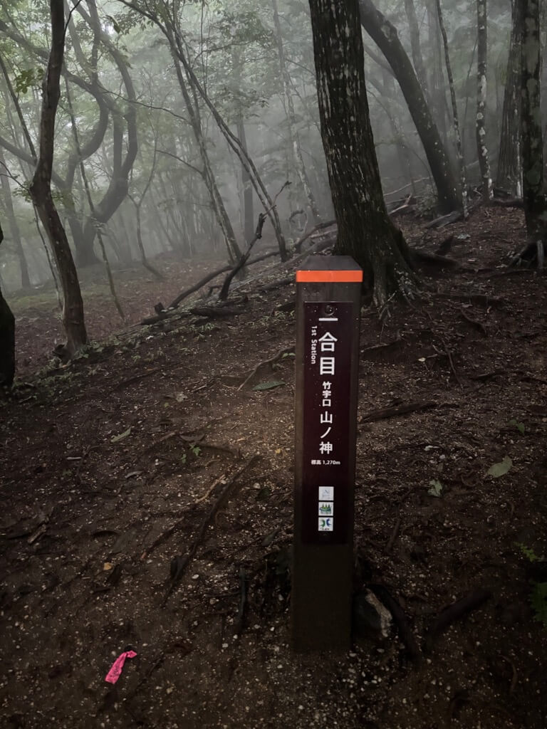 真っ暗の中、駐車場から1時間ぐらい歩いたところで、ようやく「一合目」の標がありました。