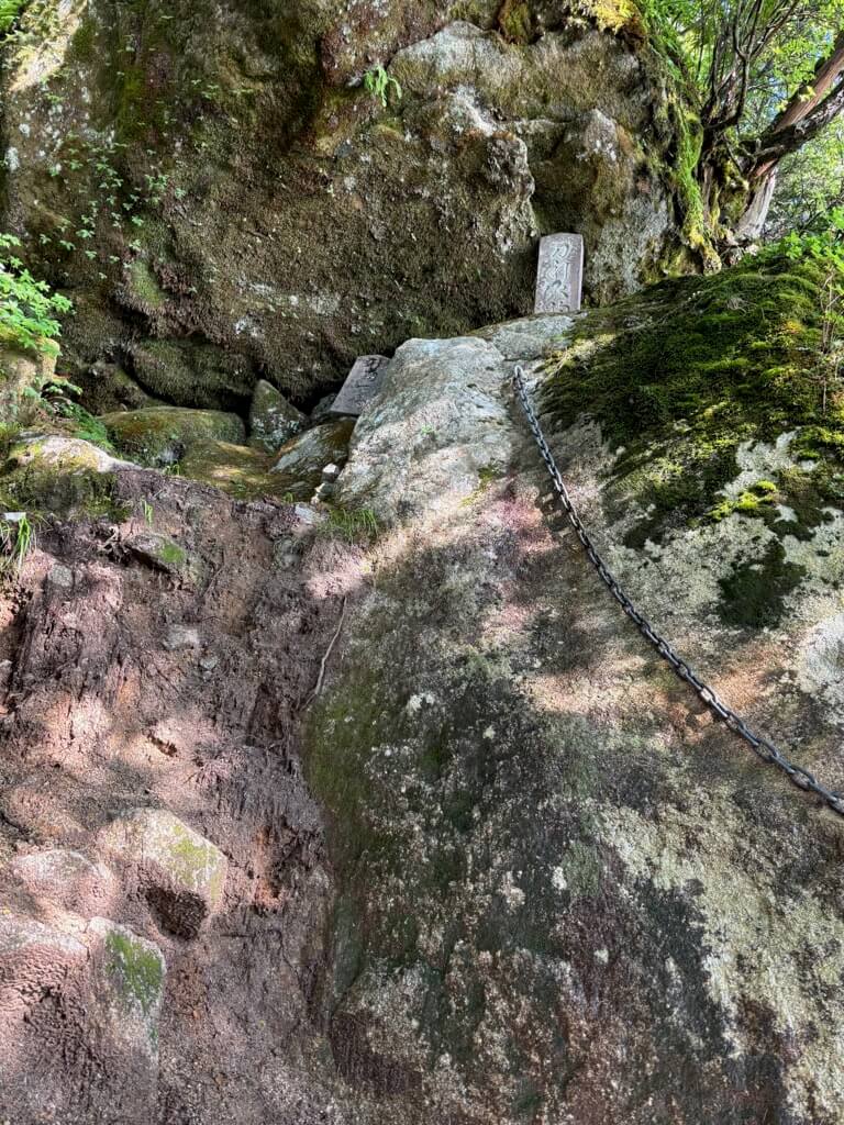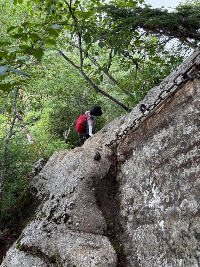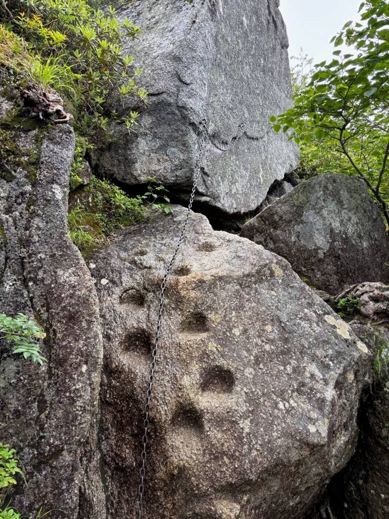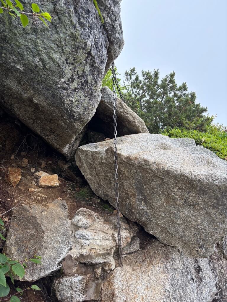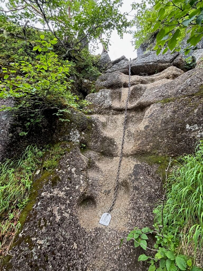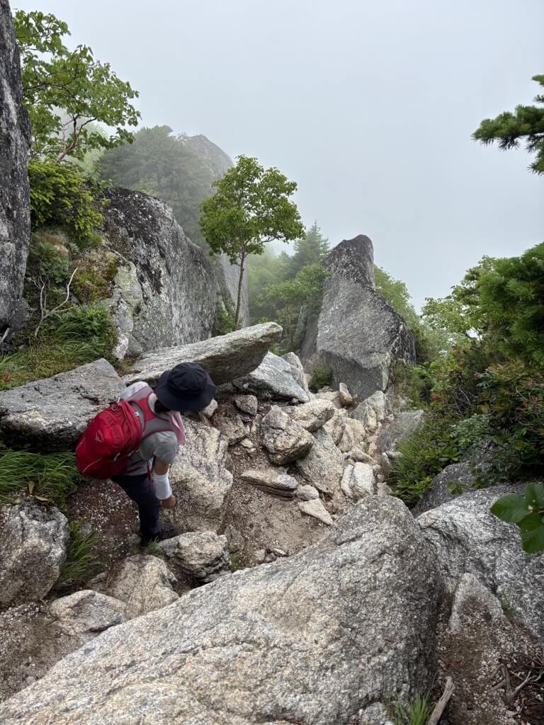 九合目近く、巨岩が登山道を塞ぎます。岩横を回り込んだり、よじ登ったりしながら進んでいきます。