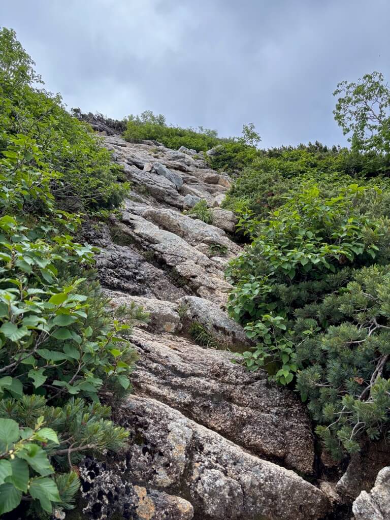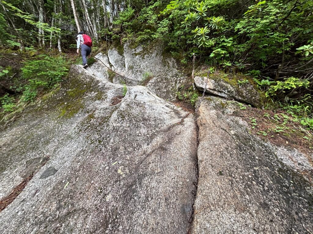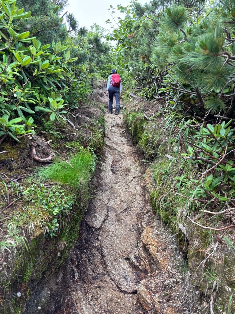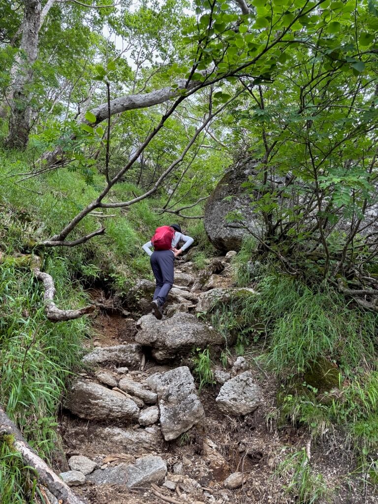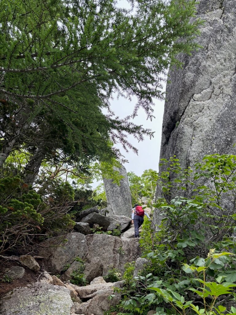樹林帯を抜け、登山道は大きな岩の上を歩いたり、ハイマツの道となります。