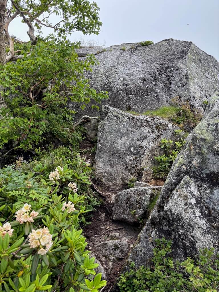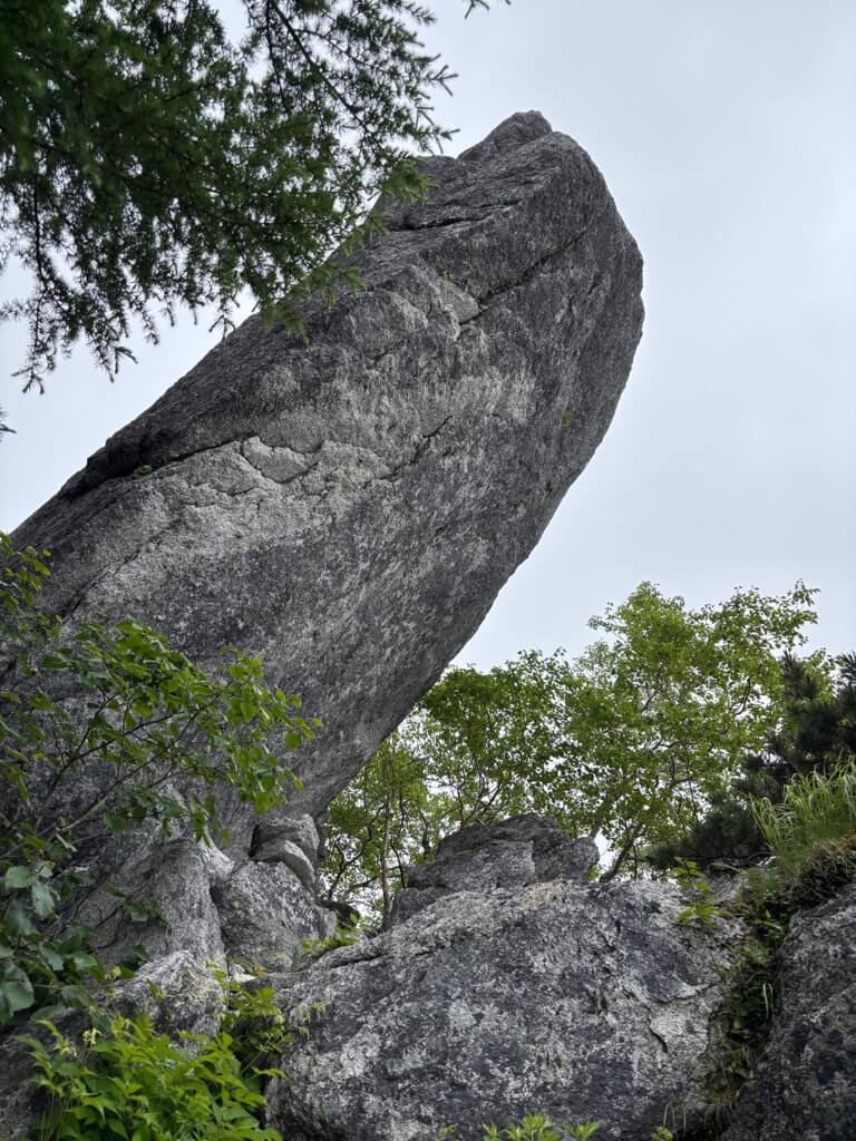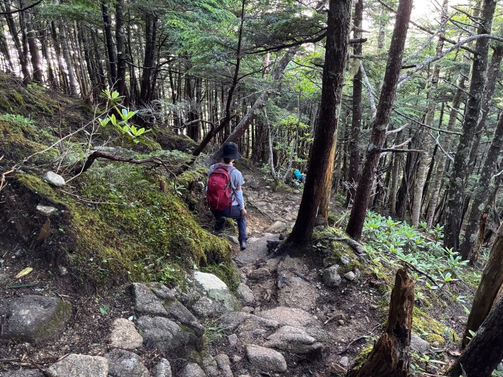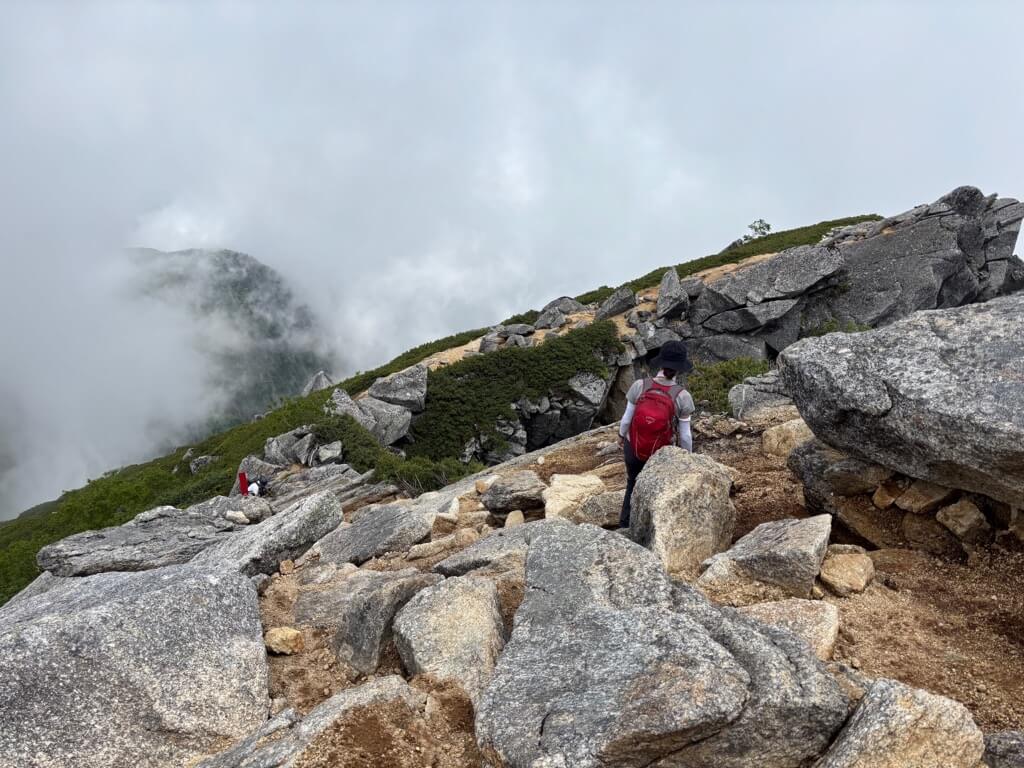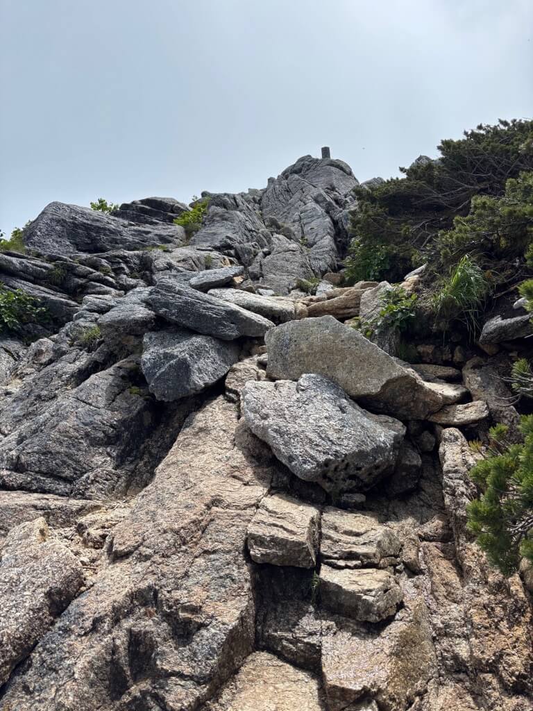 樹林帯を抜け、登山道は大きな岩の上を歩いたり、ハイマツの道となります。
