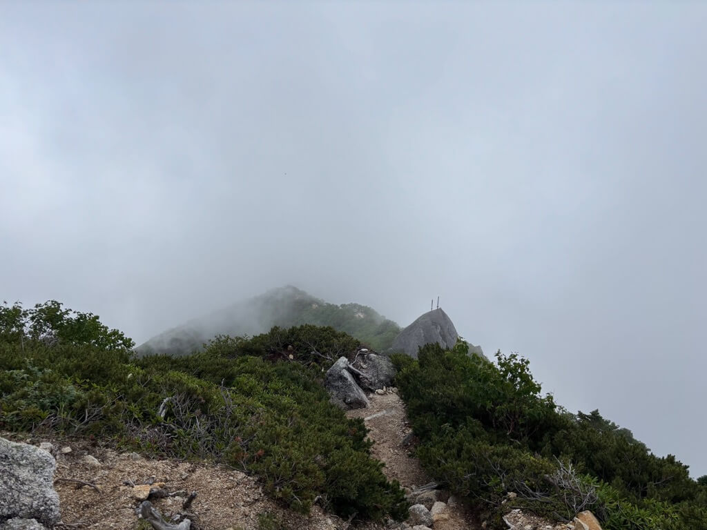 黒戸尾根側は雲に覆われて視界が悪いですが、登ってきた道が見えると、かなり急な上り坂を登ってきたことがよくわかりました
