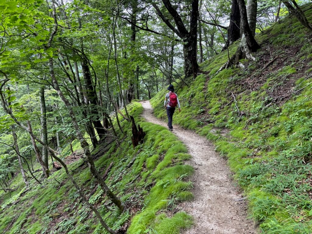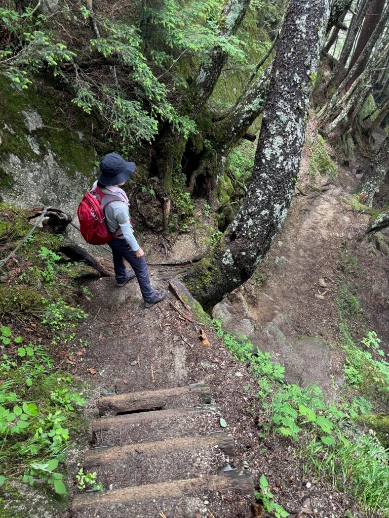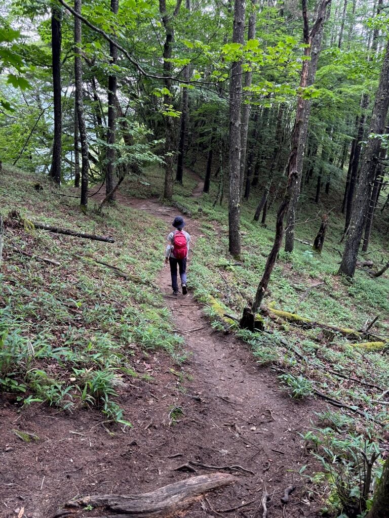 樹林帯の道はまだまだ続きます。道も急斜面な場所が出てきました。