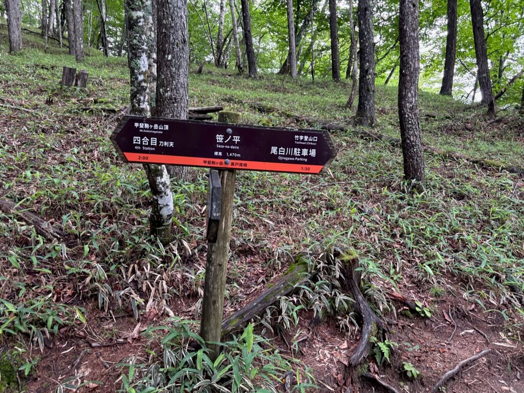 当日:尾白川渓谷駐車場(4:00)→一合目(5:00)→三合目(6:50)→五合目(7:50)→七丈小屋(18:45)→八合目(9:50)→甲斐駒ヶ岳山頂(11:00)→五合目(13:30)→一合目(15:30)→尾白川渓谷駐車場(16:20) ※全行程 12時間20分