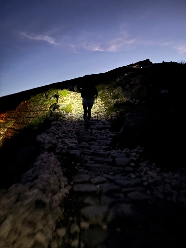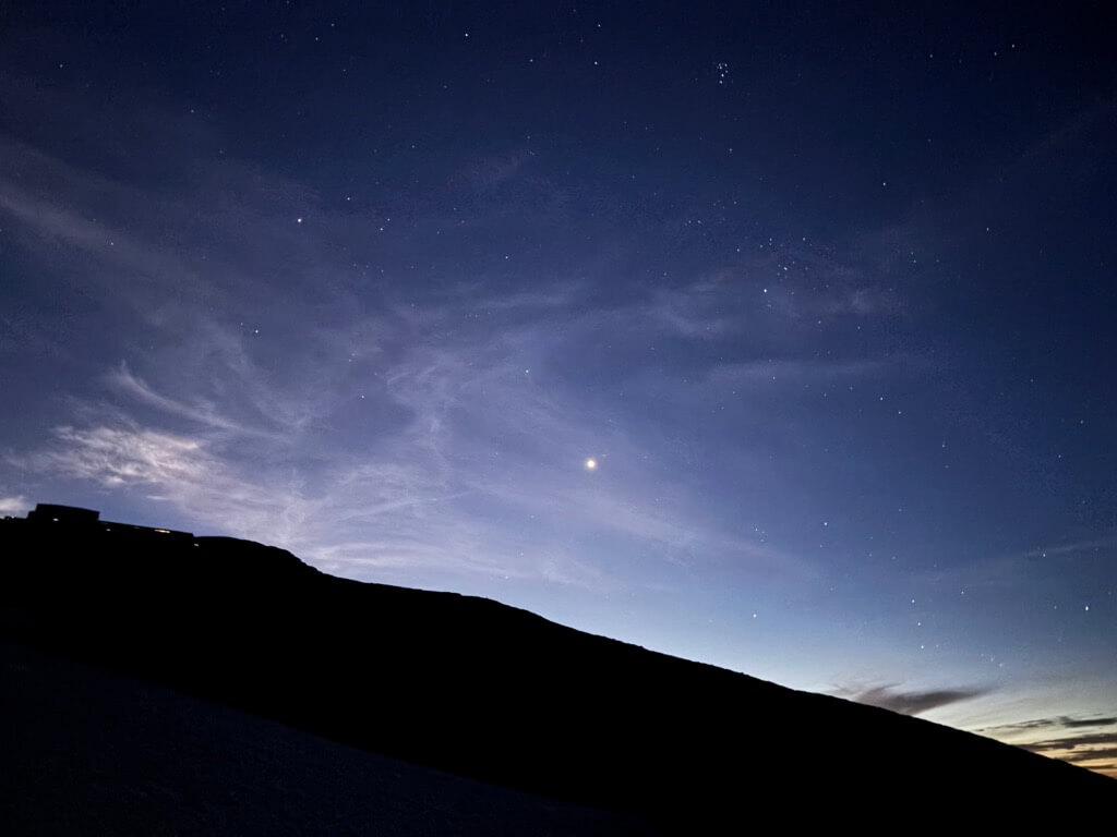 今日の朝4時に小屋を出発します。空には星が輝いていて、美しい夜明けでした。