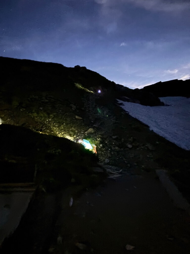 ヘッドランプをつけて、白馬頂上宿舎から白馬山荘へ登っていきます。