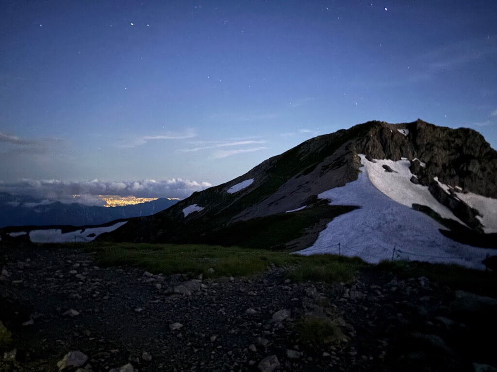 振り返ってみると、山の向こうに町の明るい灯が見えます