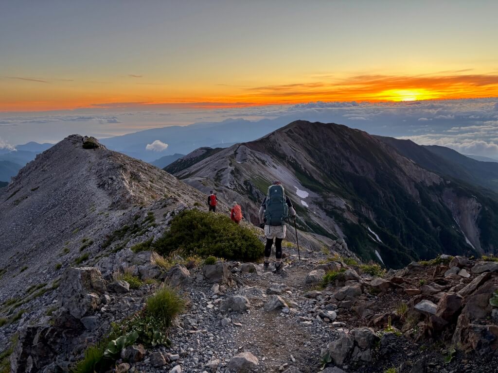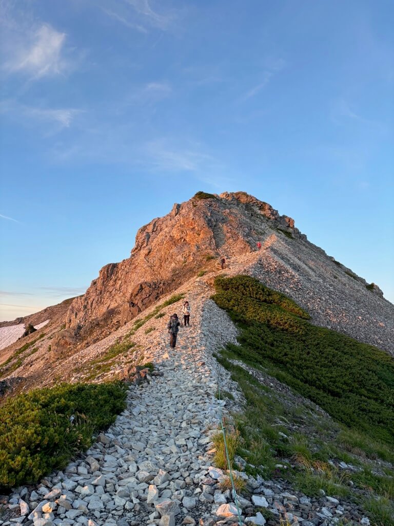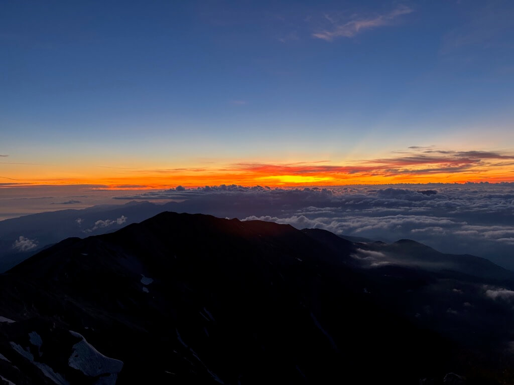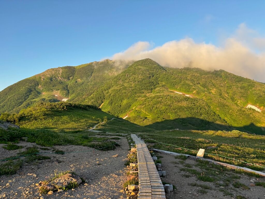 縦走3日目は朝日が登る前に白馬岳に登頂し、雪倉岳に登ってから、朝日小屋へと進みます。雪倉岳は360度の大パノラマでしたが、その後はかなり下山した後に朝日小屋へと木道を通りながら登り返していく、なかなか長い行程でした。