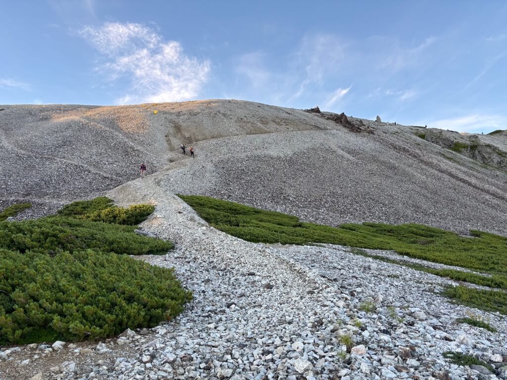 登りきって八合目ぐらいまで来ると、砂礫地になり、山頂の丘が見えてきます。