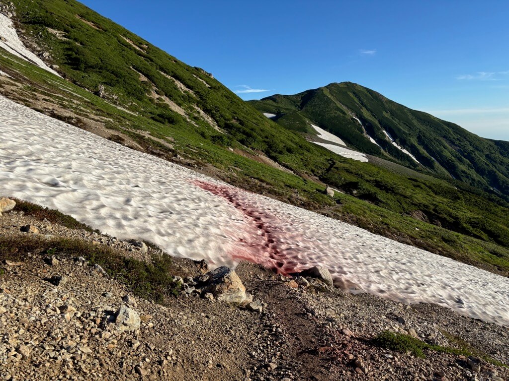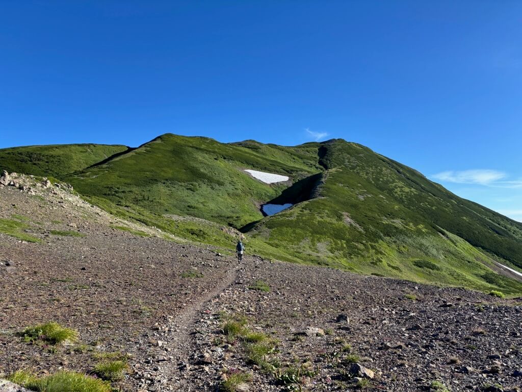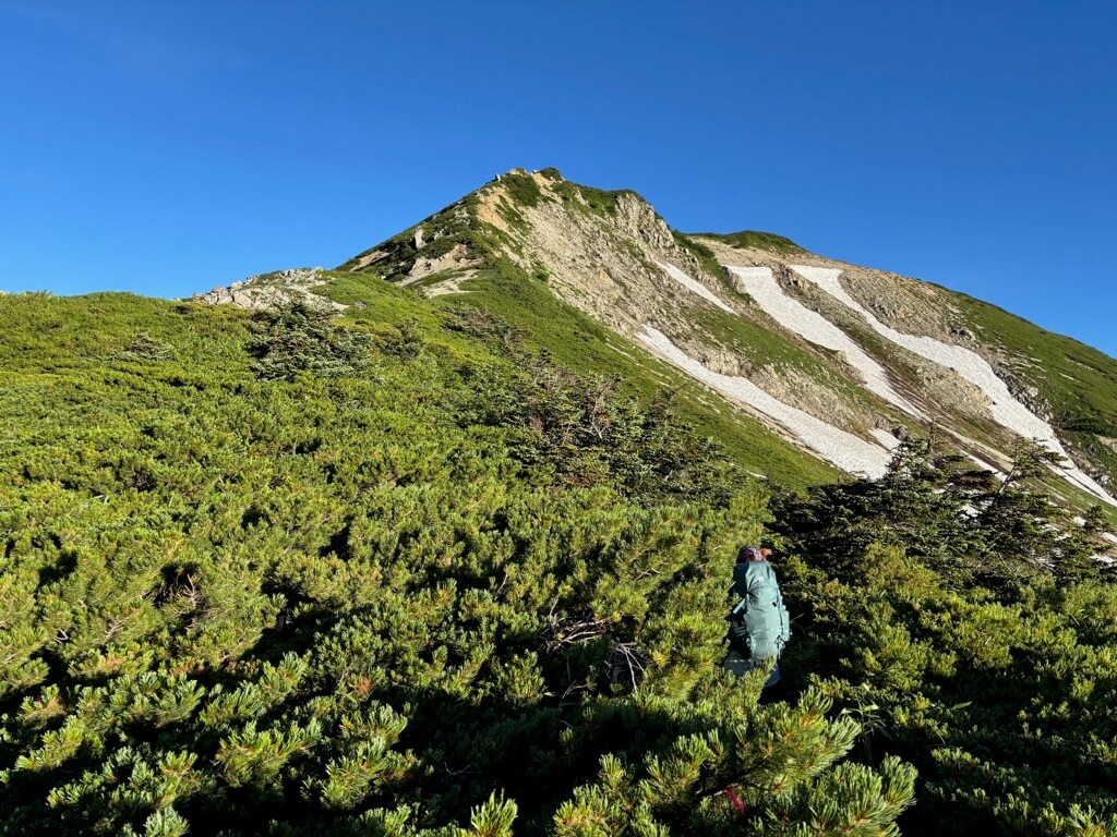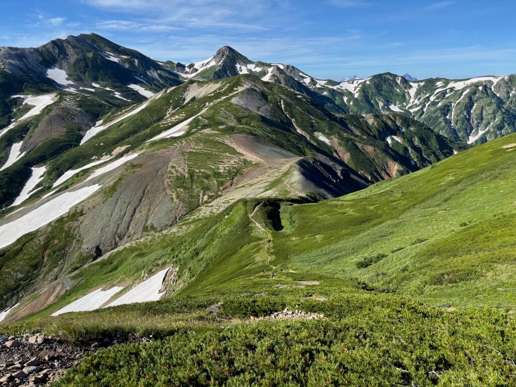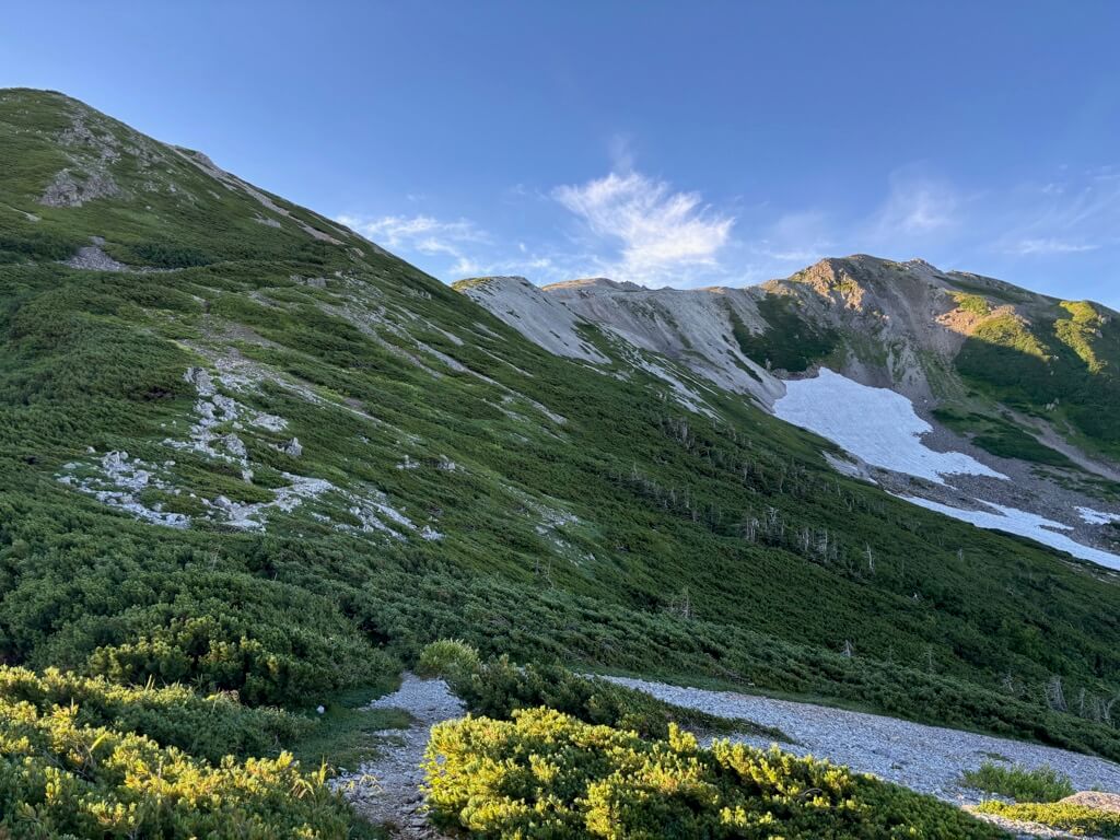 今までの砂礫地から一転、ハイマツ、雪渓、緑の登山道へ変わっていきます。山の様相が全く異なるからおもしろい。