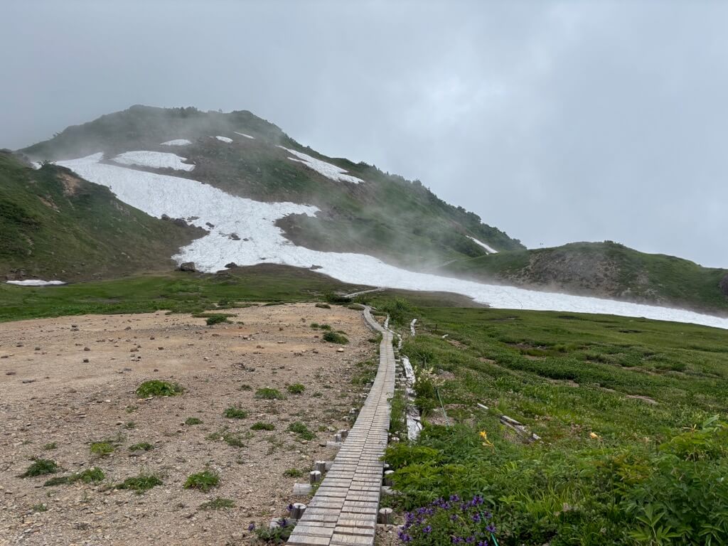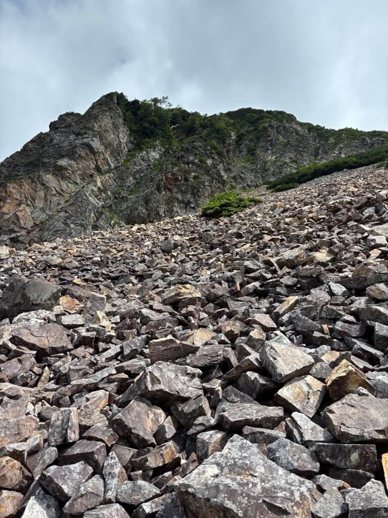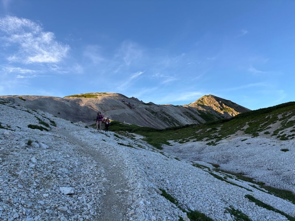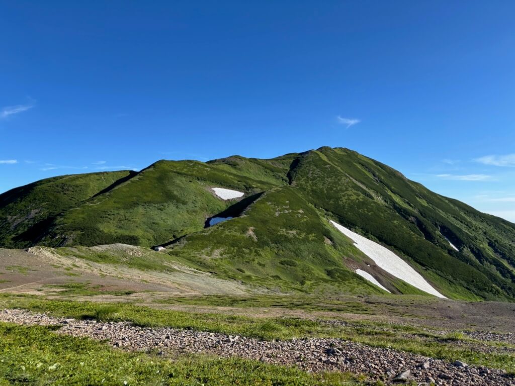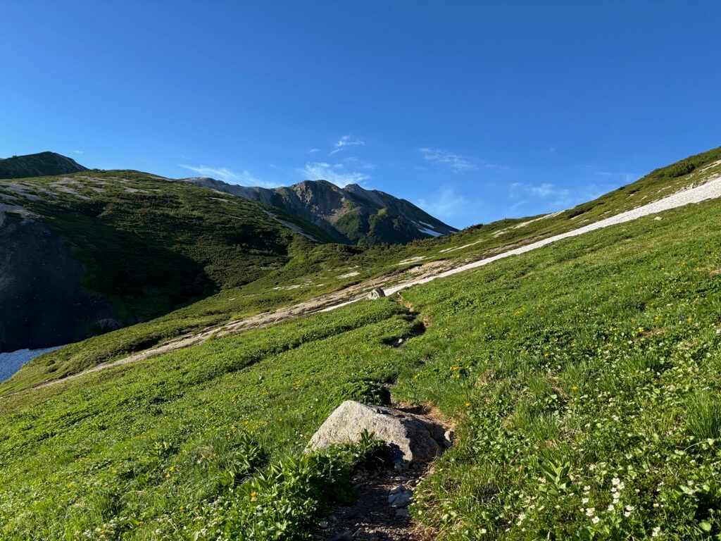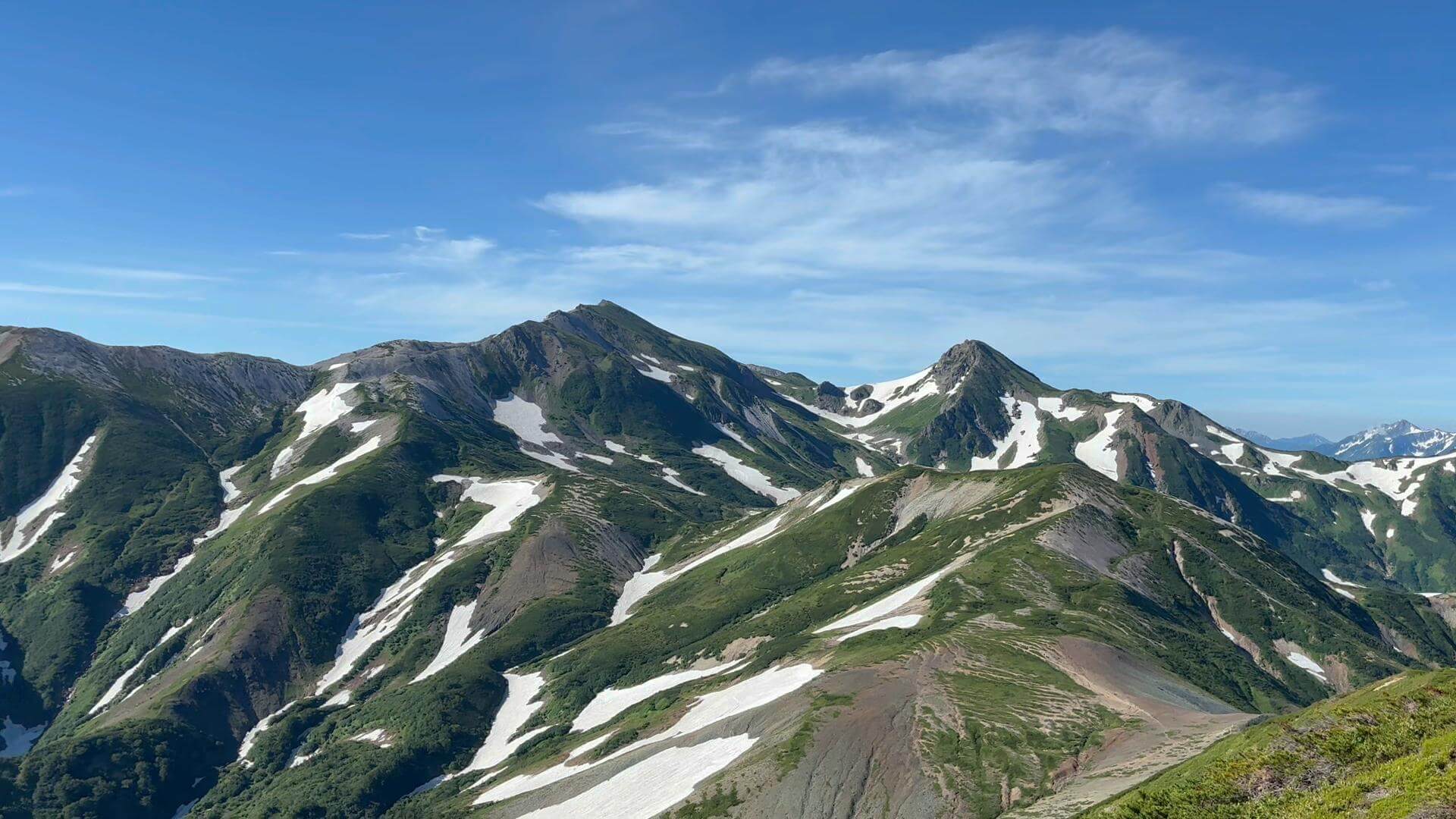 今までの砂礫地から一転、ハイマツ、雪渓、緑の登山道へ変わっていきます。山の様相が全く異なるからおもしろい。