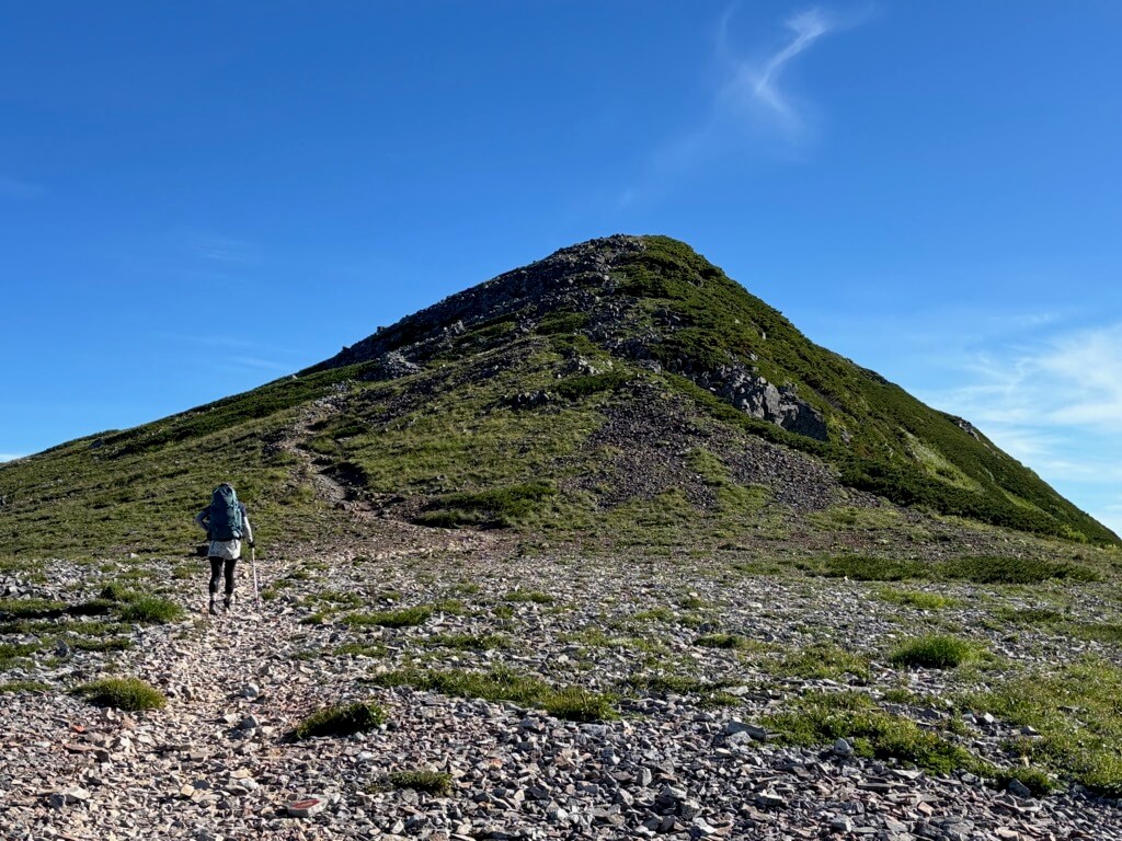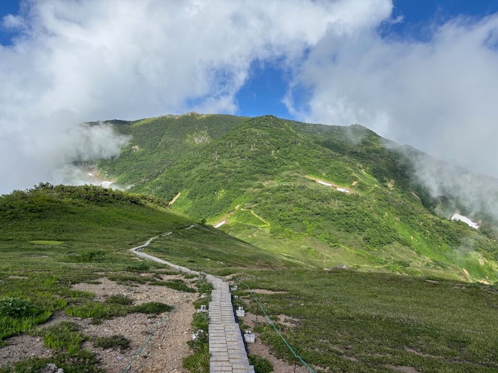 朝日岳近くの高い山が見えてきました。今日のゴール朝日小屋はあの向こうの筈。