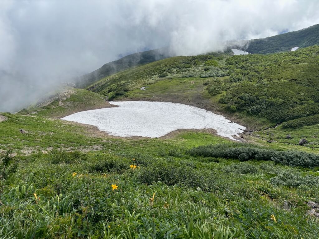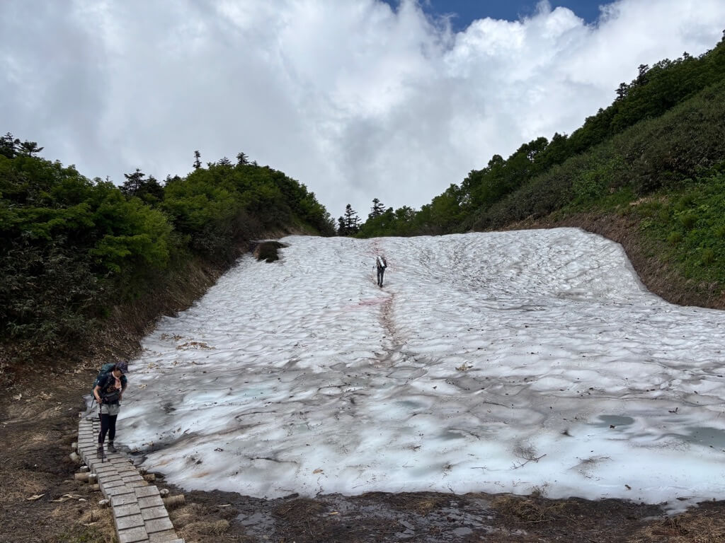 少し標高が上がってきて、雪渓の上は涼しい風が吹いています。