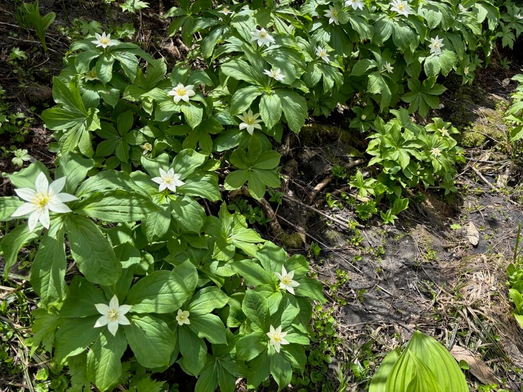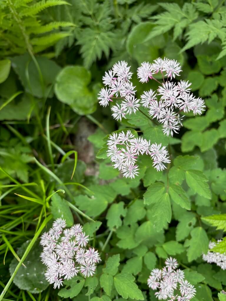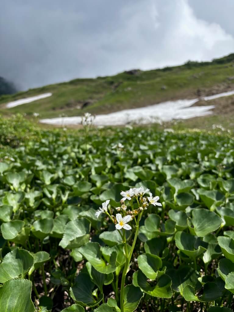 雪渓を過ぎて、また樹林帯に入ると、キヌガサソウが木道の横に群生していました。
