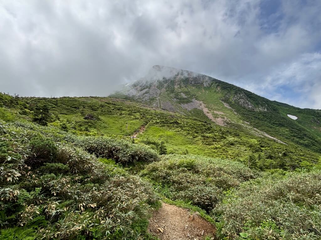 手前の山は巻いて、右側の雪倉岳へと進みます