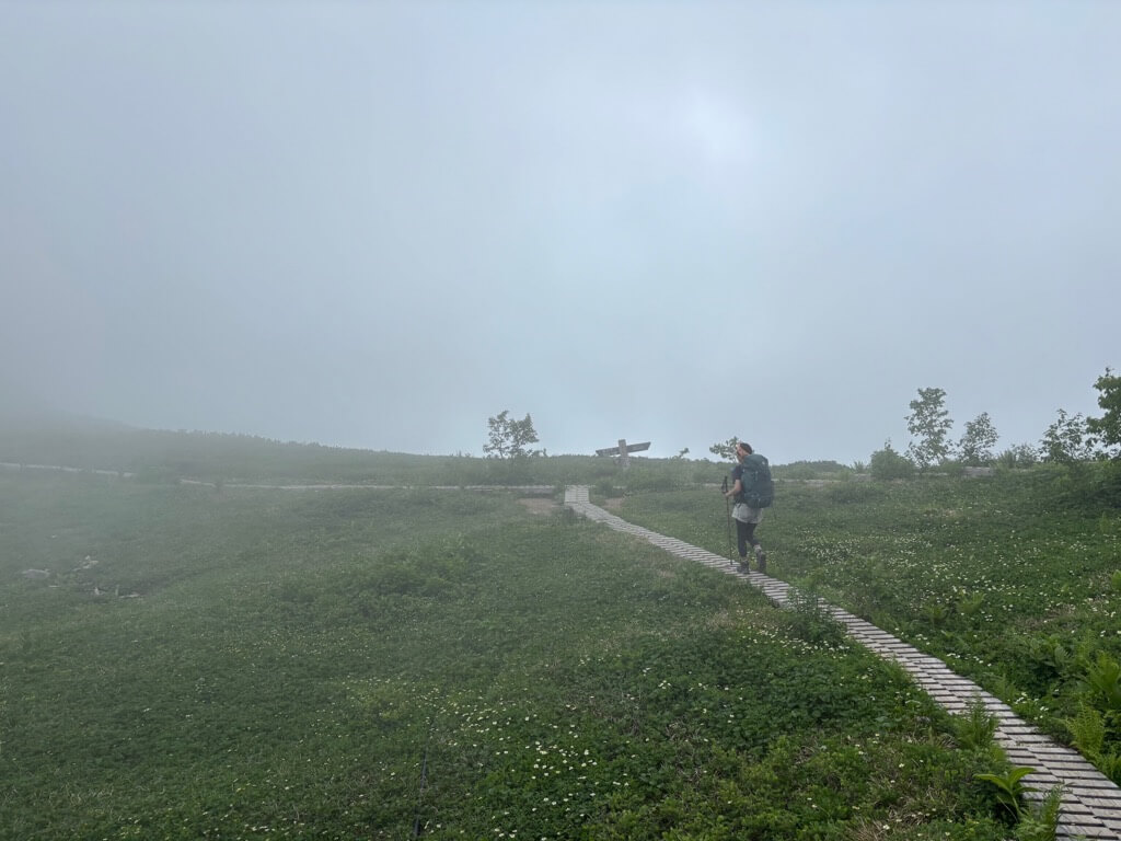 朝日小屋の周辺は霧がかかっていて、真っ白になっていたため、全く見えなかったのですが、もうすぐ近くに来ていたみたいです。沢から30分ぐらい、再び現れた木道を歩いていくと、朝日小屋に到着します。