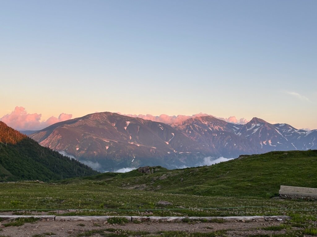 今日歩いてきた白馬、雪倉の山が夕日を浴びてピンク色に。アーベントロード