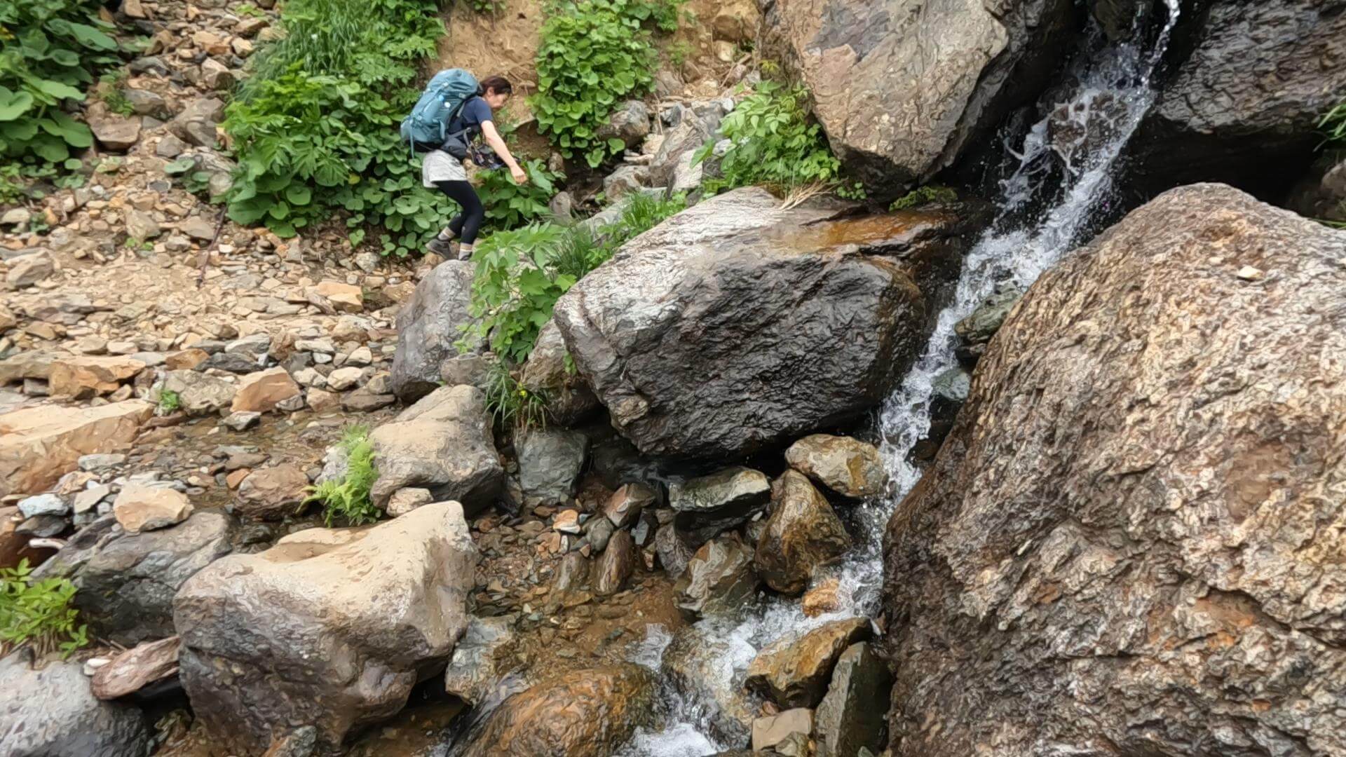 なにしろ暑かったので、途中で沢で一休みし、冷たい水に手ぬぐいを浸して首筋に当てて、クールダウン。