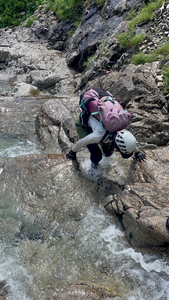 ※いつも丹沢の沢では使っているワークマンのタイツが、北アルプスの水の冷たさに対して、薄くて心許なかったのですが、「乾きやすい」というメリットもありました。ただ、今回は晴れていて、外気は暖かったのと、泳ぐようなところは少なかったので、今回の装備でも結果的にOKをでした。でも次に来るまでには、もう少しちゃんとした沢用のタイツを買おうと思いましたw
