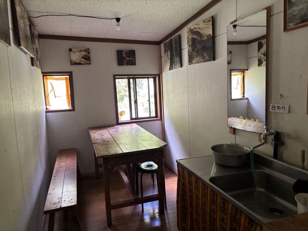 ラーメンを食べて、沢で濡れたものを日差しのある外に干してから、小屋にチェックイン。