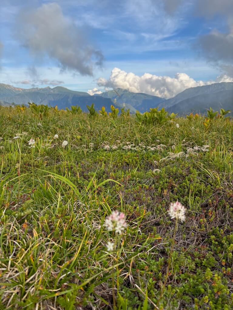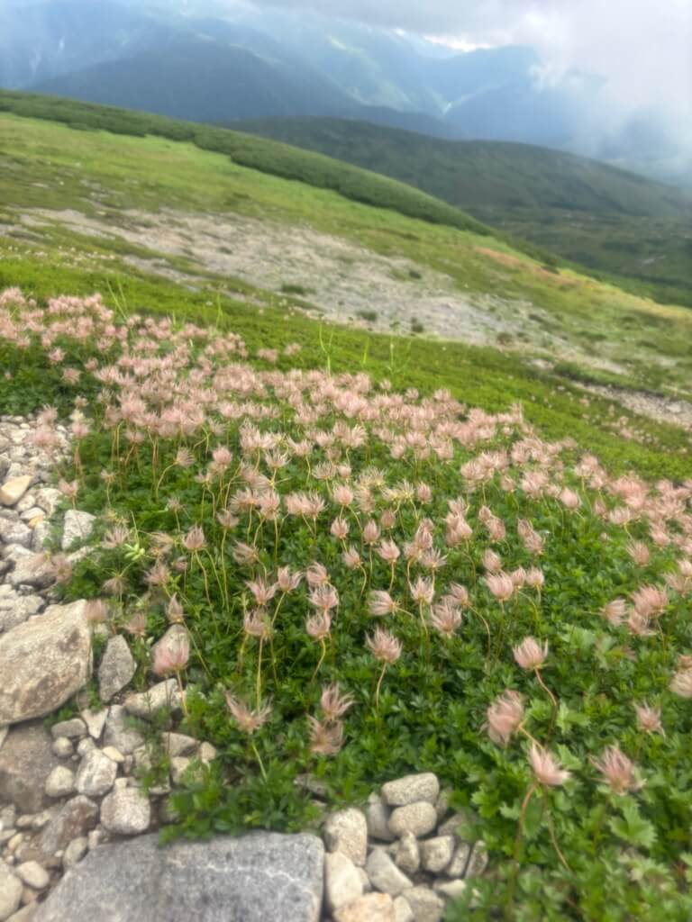 雲の間から時折山が見えて、足元にはチングルマの綿毛の群生が咲いています。