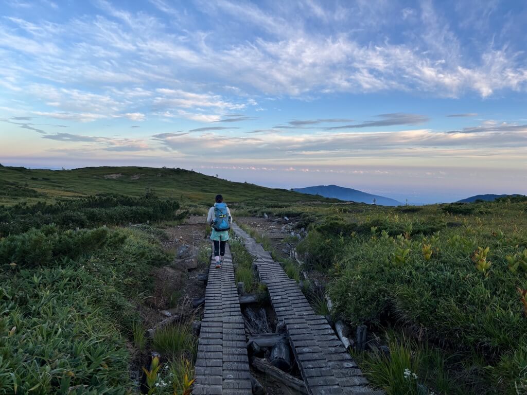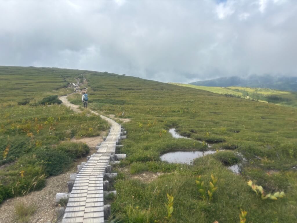 さらに歩くと木道になり、池塘が点在する野原をゆるゆると歩いていると、太郎平小屋が見えてきます。