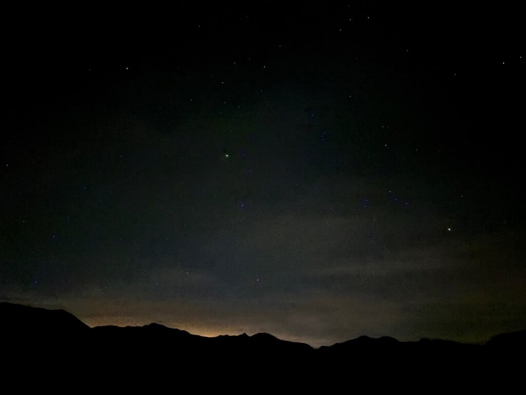 山の向こうの町の明かりなのか、ちょっとだけ明るいのが意外⋯。