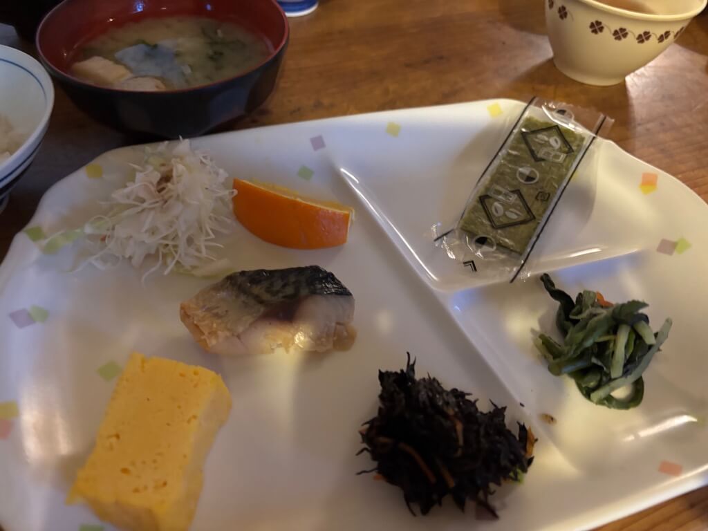 朝ごはんも「和定食」。ごはん、味噌汁、卵焼き、ウィンナー、焼き魚、きんぴら。ご飯のお供に梅干しとらっきょ。