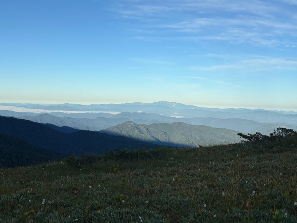 反対側の水晶、赤牛岳の方向、暗闇の中でうっすら山の稜線が見えました。