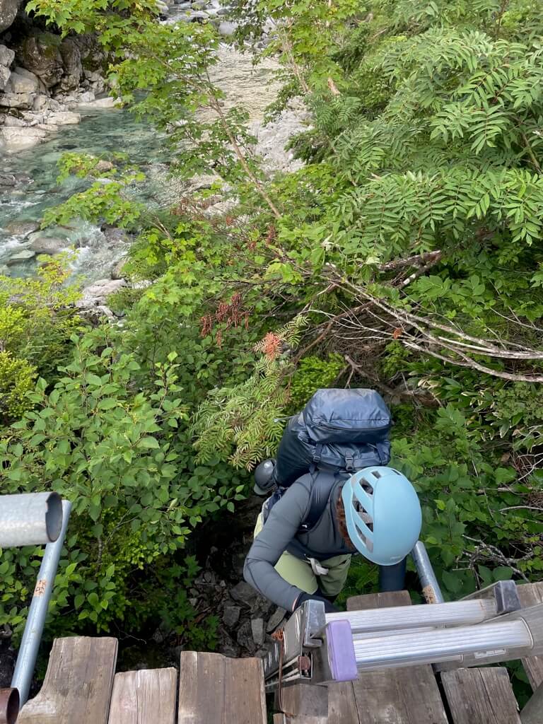 ガイドさんの指示があったので、沢用ハーネスに環付カラビナ2つをビレイループにつけ、もう2つは予備でギアループに下げておきます。セルフビレイコード(PAS等)や、ATCガイドなどは持参したのですが、特に付けませんでした。ガイドさんや山行によって持って行くものが異なるのなぁという印象です。