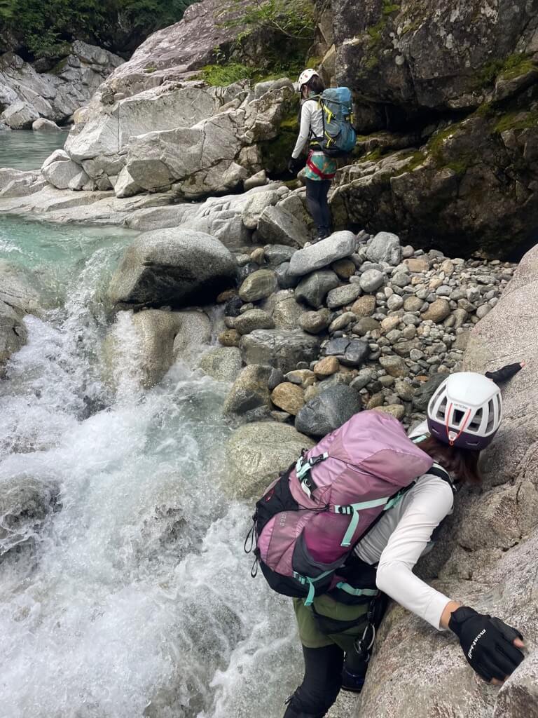 水が冷たいのでなるべく全身浸からないように、浅くて急流ではないところを選んで行くのですが、どうしても膝上から腿まで水に浸かるところがあり、流れに押されてバランスを崩すと沢にドボンしそう⋯。
