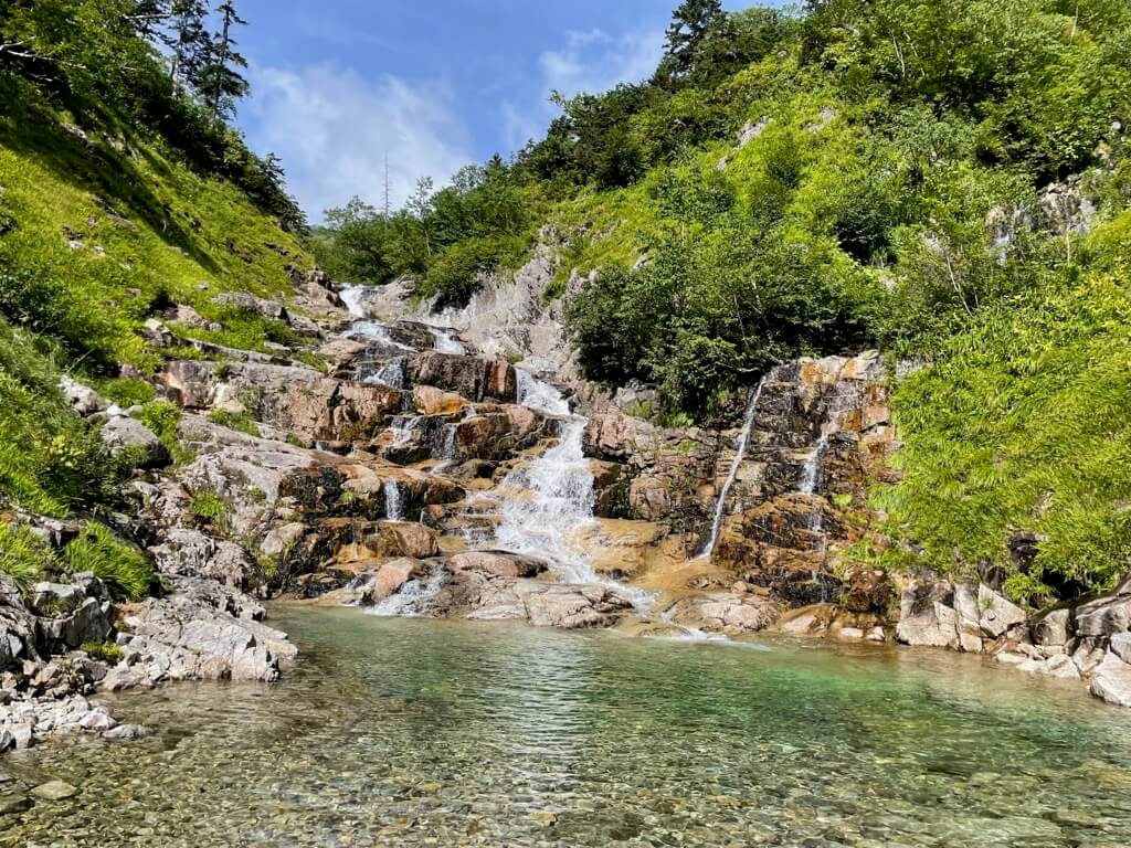 黒部川源流にある渓谷で、奥黒部一の美渓といわれるそうです。ナメ滝や大滝などが各所にあり、訪れる人を飽きさせません。