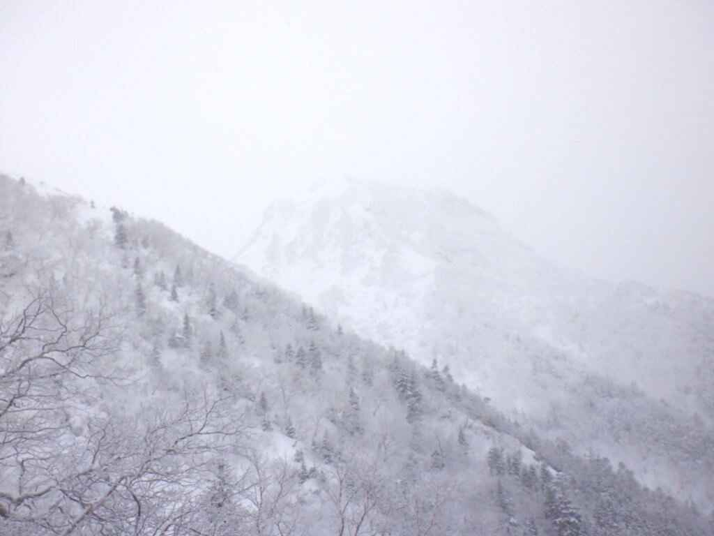 歩いている途中、曇り空の中にうっすら雪の阿弥陀が見えてきました。