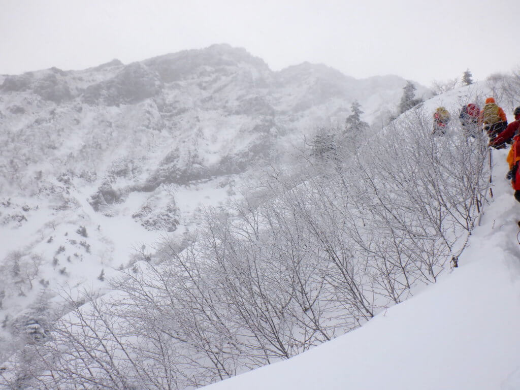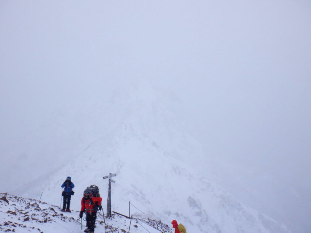 さらに急登が続きます。登っていると足がつらい。息も上がるが、ゴーグルやらバラクラバやらヘルメットやらフードやら、なにしろ顔回りが不自由すぎて、顔や頭が動かしにくい。視界も不良…。風も吹いてきて、ピッケル持つ手が冷たくなる。